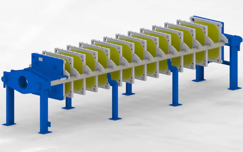O filtro prensa é composto por 3 partes principais: a estrutura, a parte filtrante e a unidade hidráulica. Nosso design do filtro prensa com duas colunas longitudinais laterais permite fácil manutenção, removendo as placas da parte superior do dispositivo.